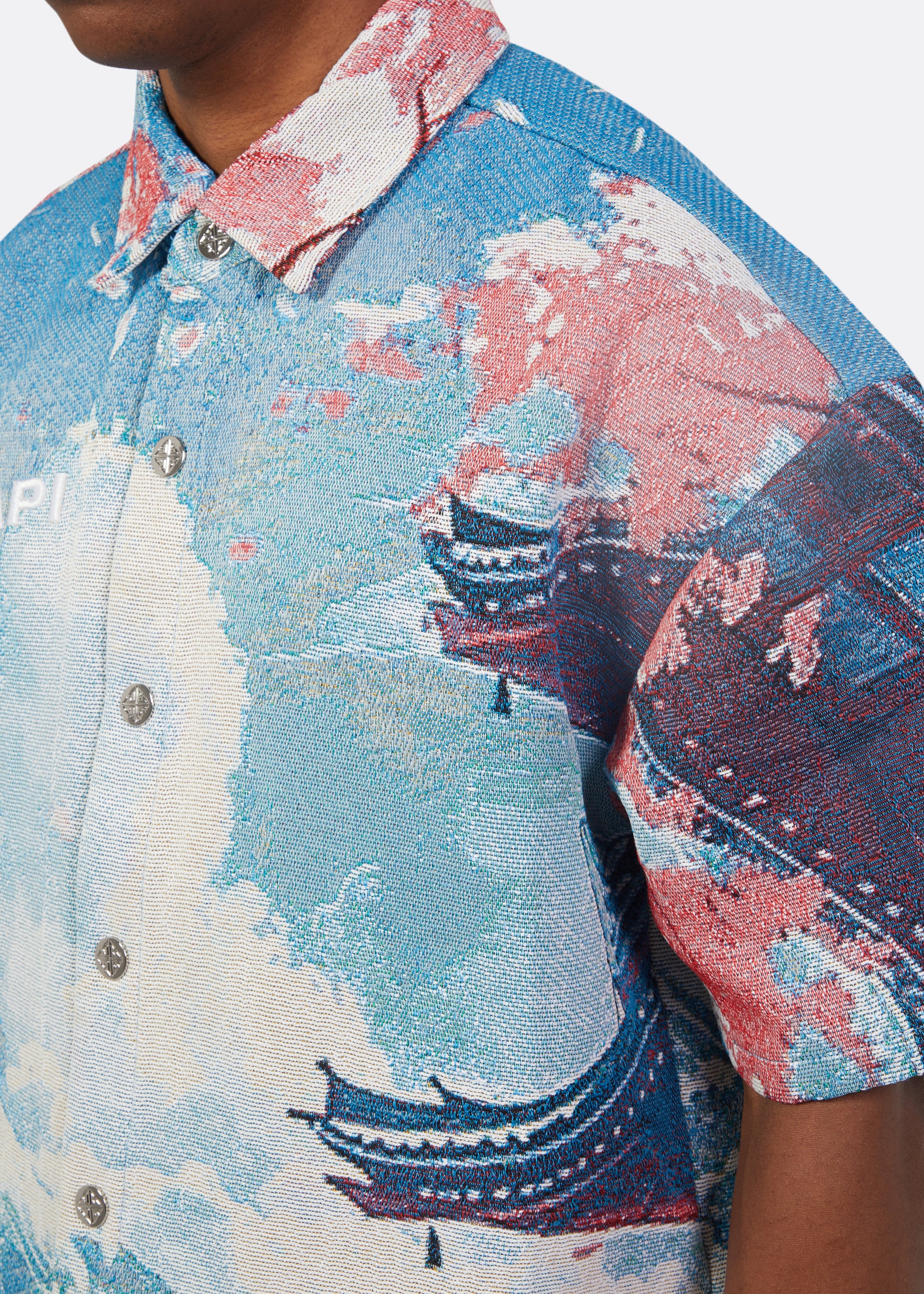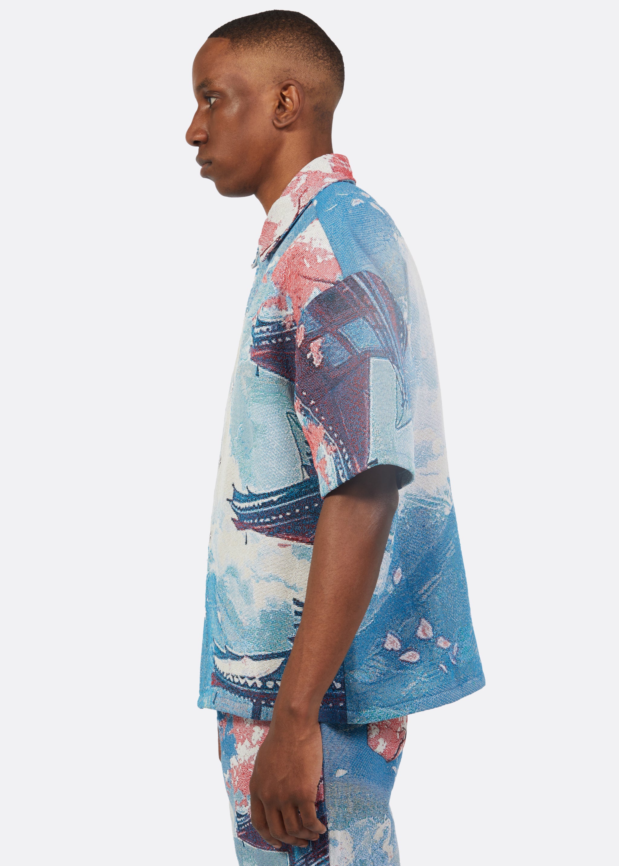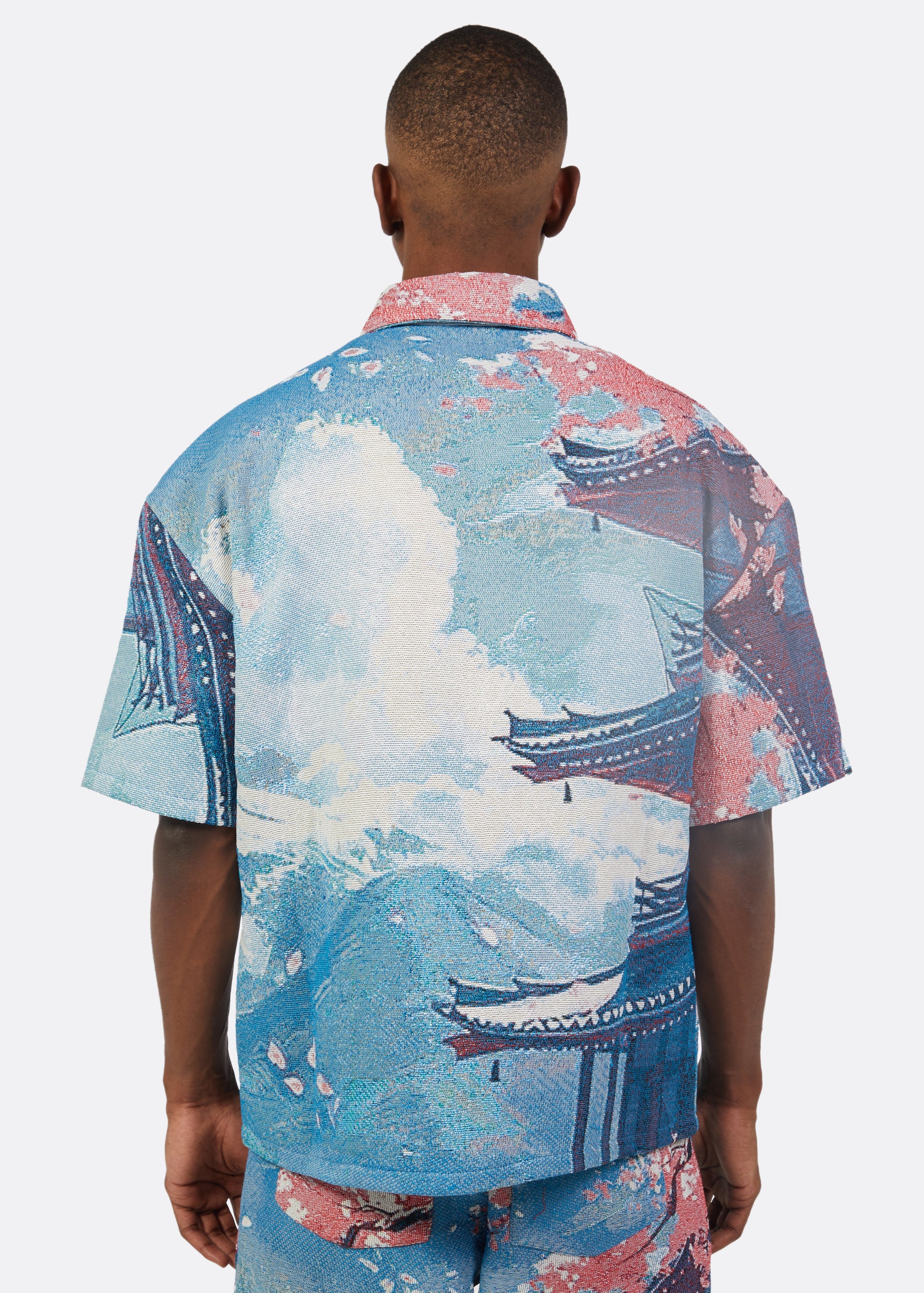 The Tokyo Tapestry Shirt brings art and fashion together in a striking, short-sleeve silhouette. This button-up shirt showcases an intricate woven tapestry design in shades of blue, pink, and white, depicting waves and landscapes reminiscent of Japanese art. Crafted to make a bold statement, this shirt adds a vibrant, modern twist to classic style.
