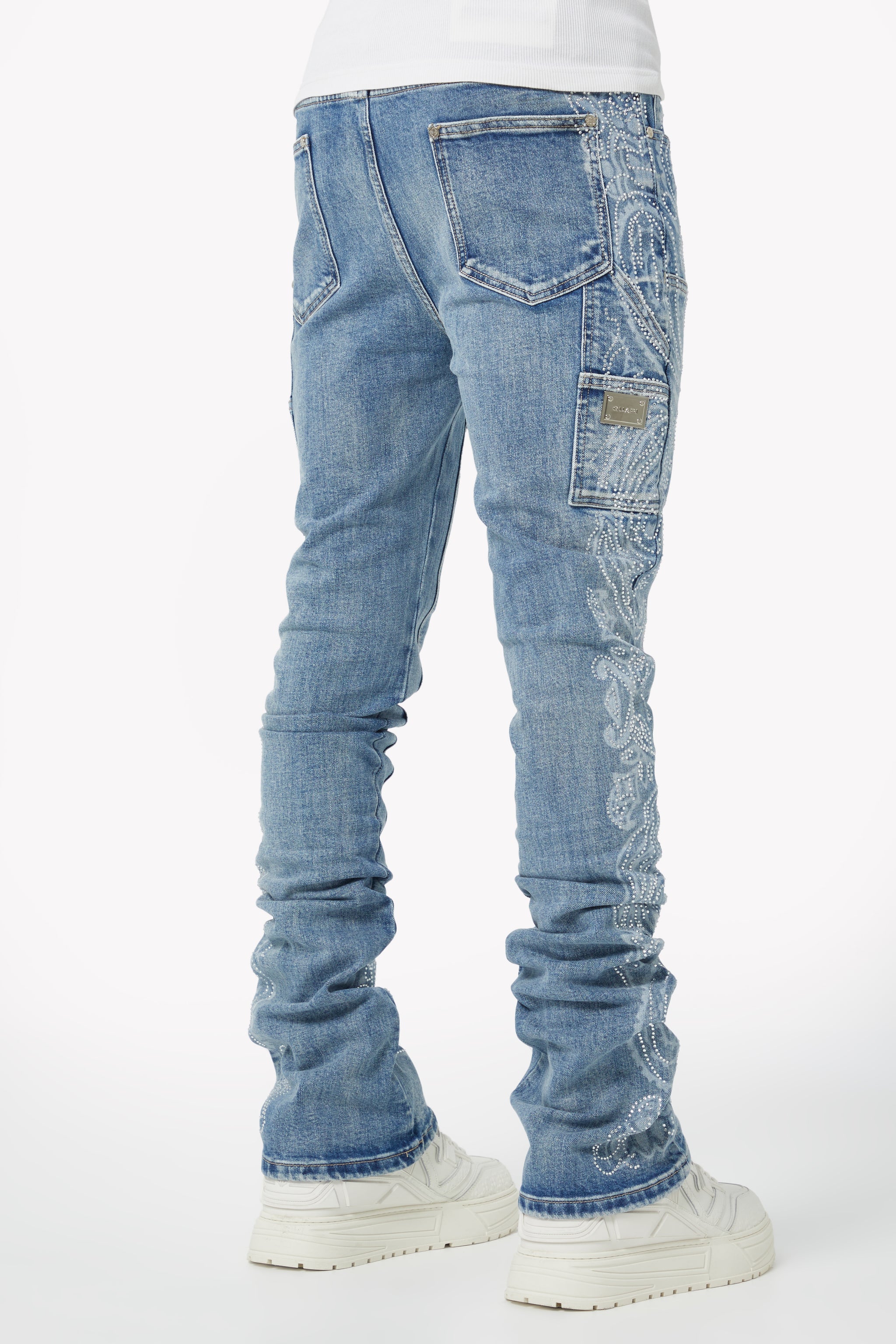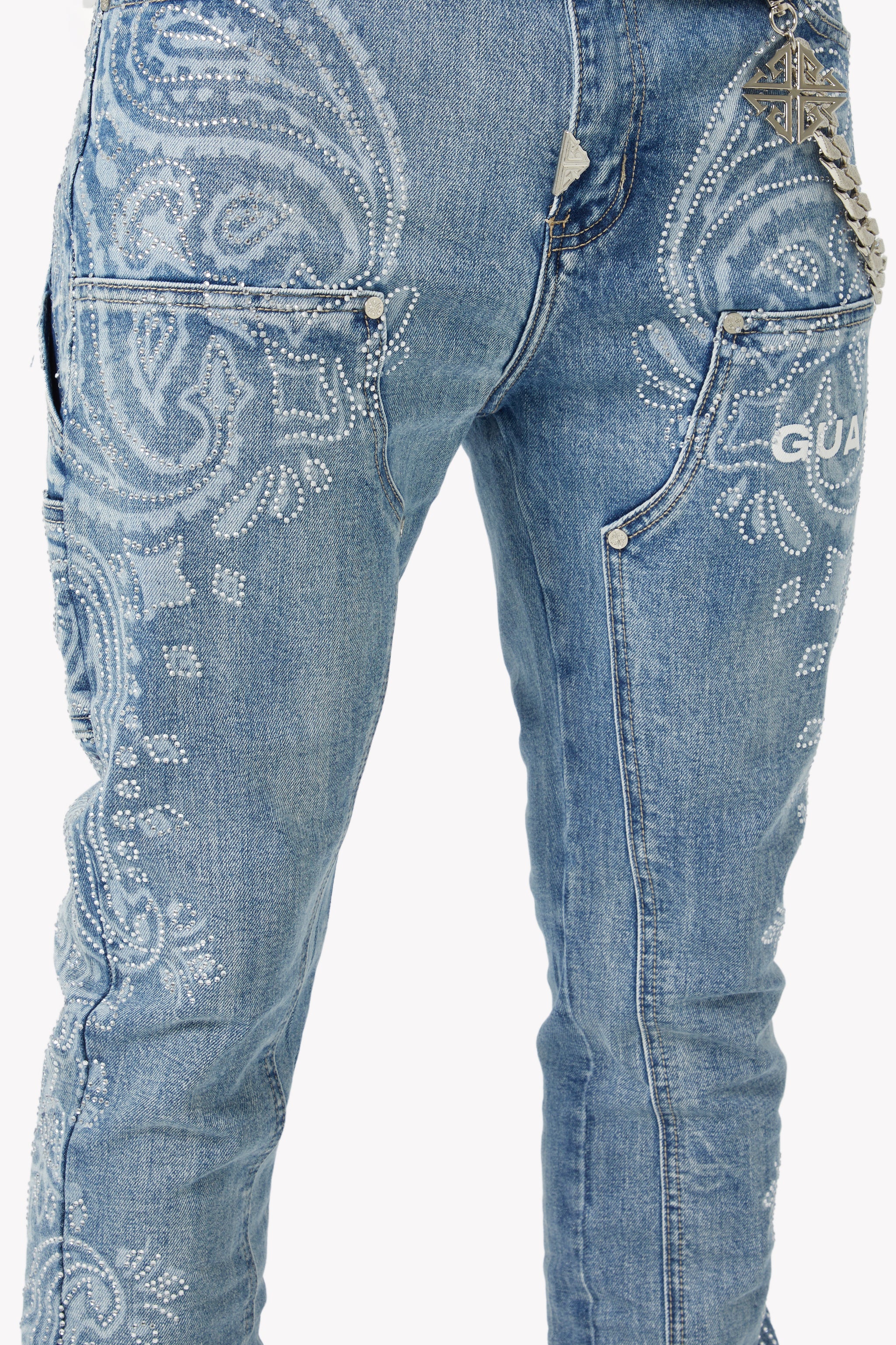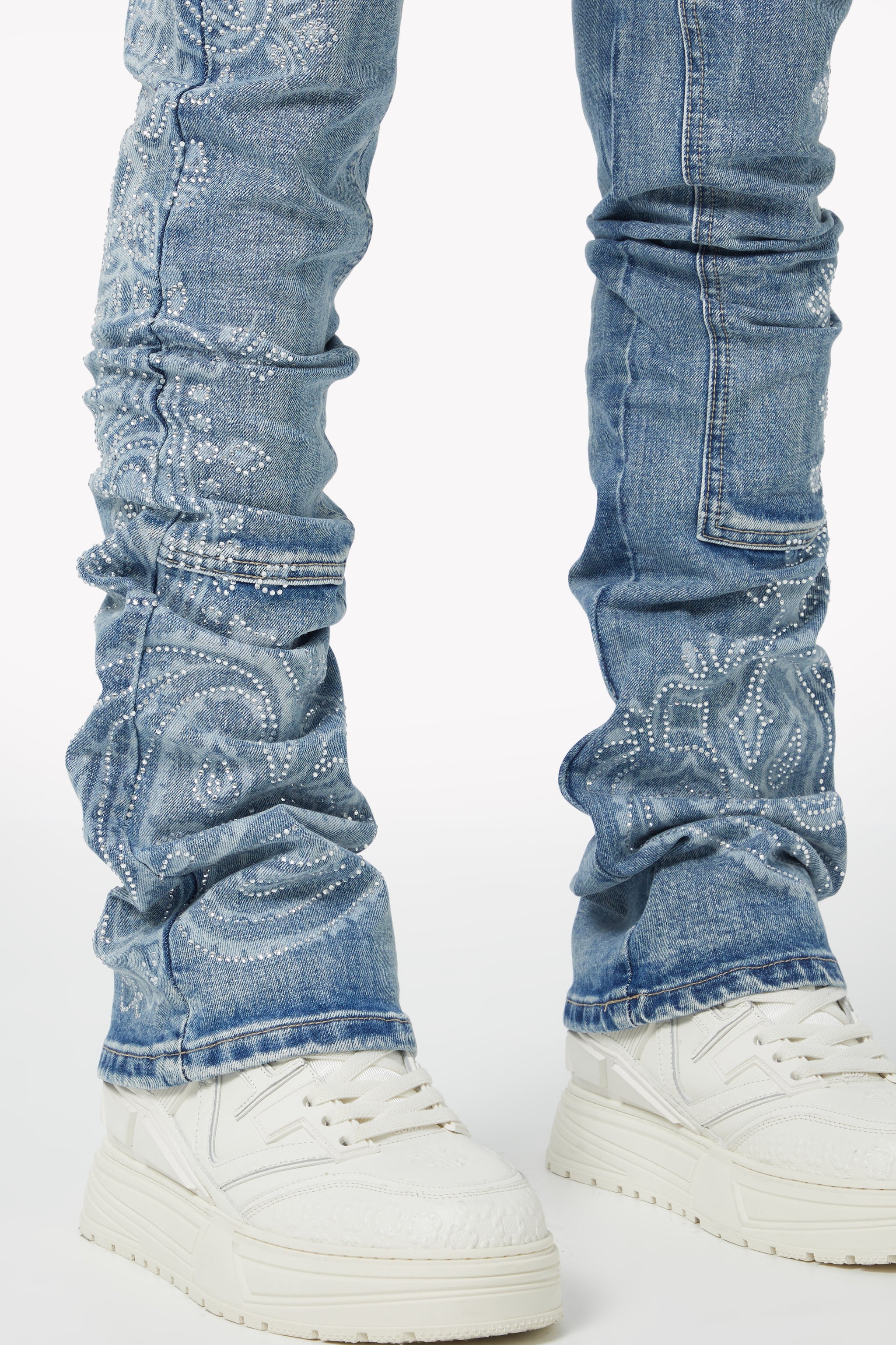A bold reinterpretation of classic denim, the Vintage Blue Paisley Denim blends intricate artistry with a street-luxe edge. Crafted from premium light-wash denim, the pants feature an all-over paisley motif, laser-etched into the fabric and accentuated with dazzling crystal embellishments. The stacked leg design adds volume and texture, while the tailored slim fit ensures a modern silhouette.