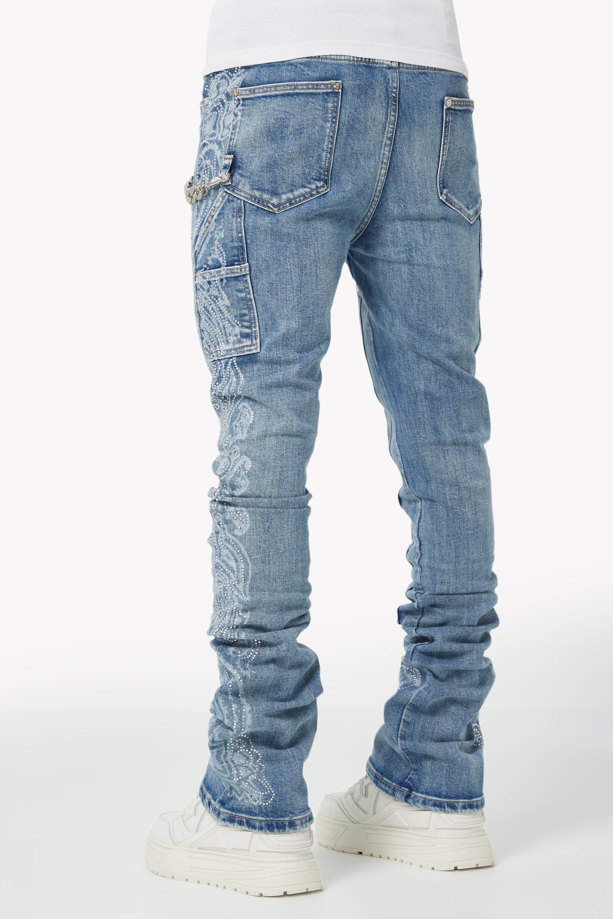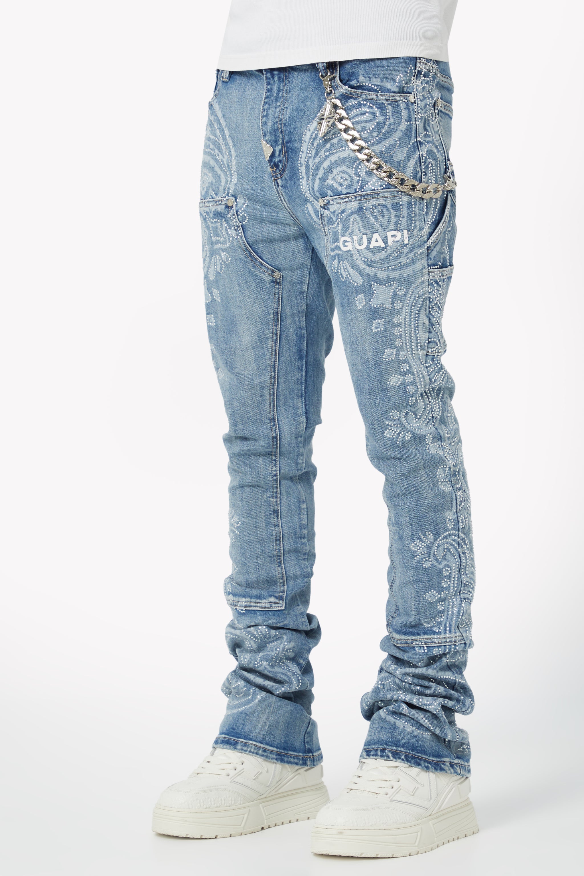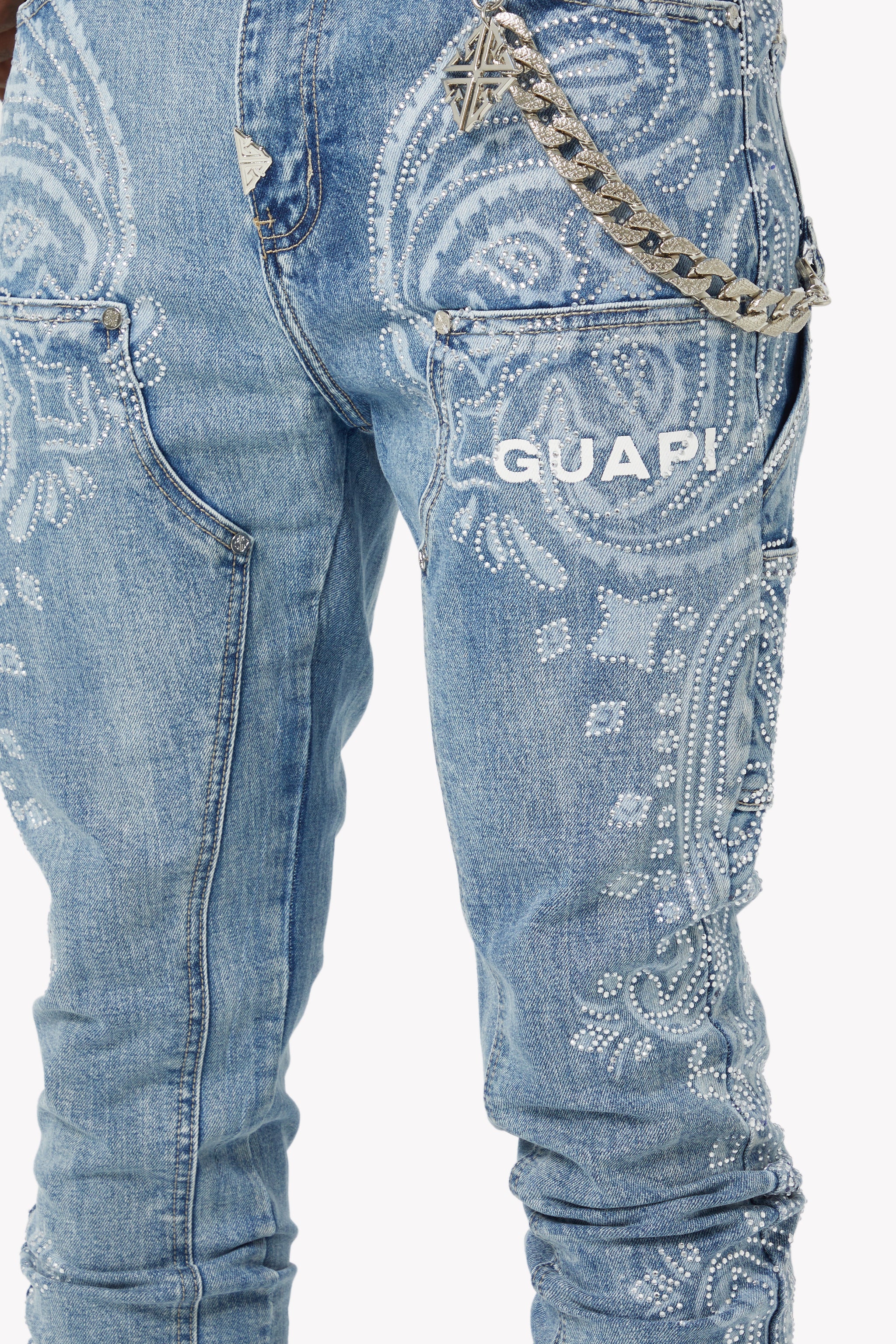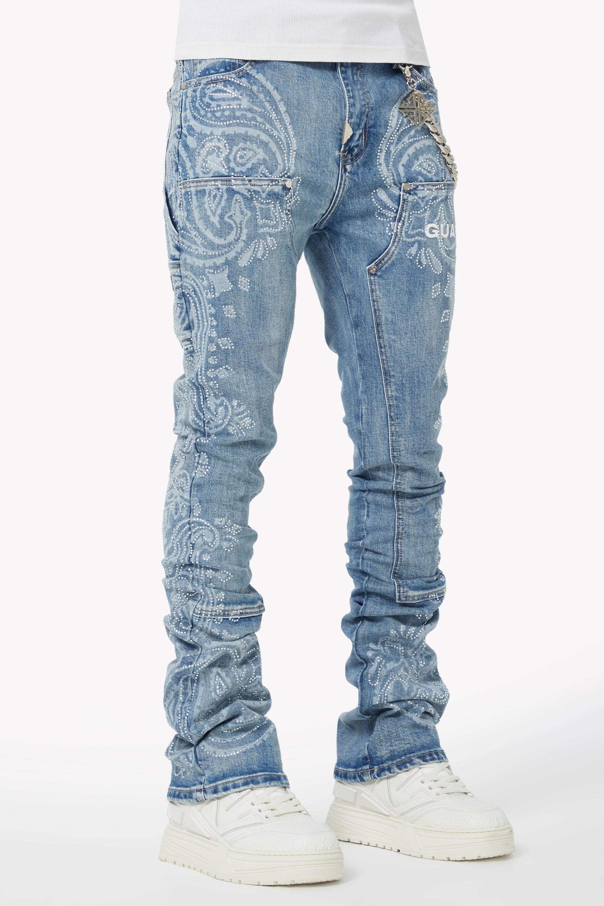 A bold reinterpretation of classic denim, the Vintage Blue Paisley Denim blends intricate artistry with a street-luxe edge. Crafted from premium light-wash denim, the pants feature an all-over paisley motif, laser-etched into the fabric and accentuated with dazzling crystal embellishments. The stacked leg design adds volume and texture, while the tailored slim fit ensures a modern silhouette.
