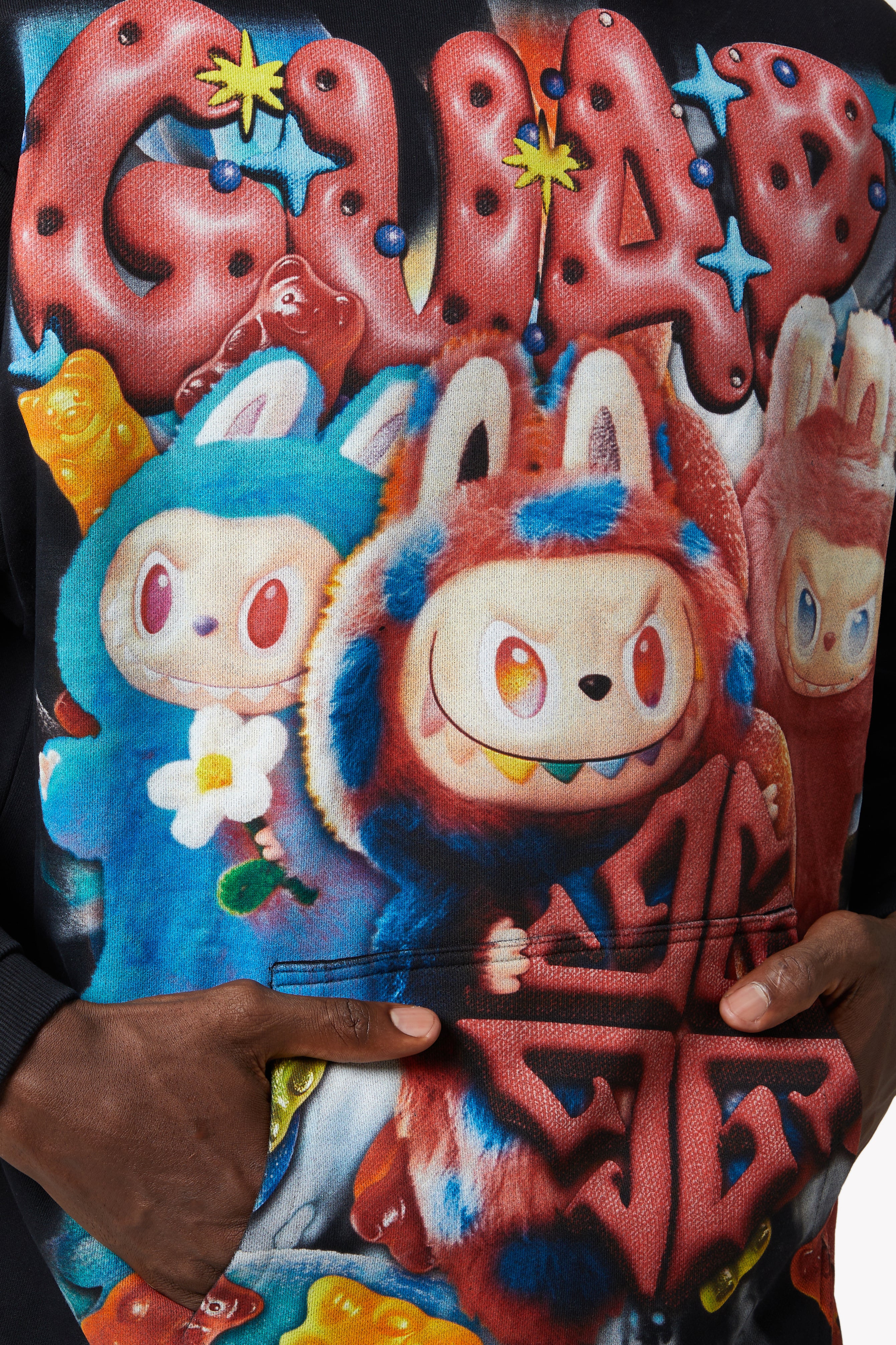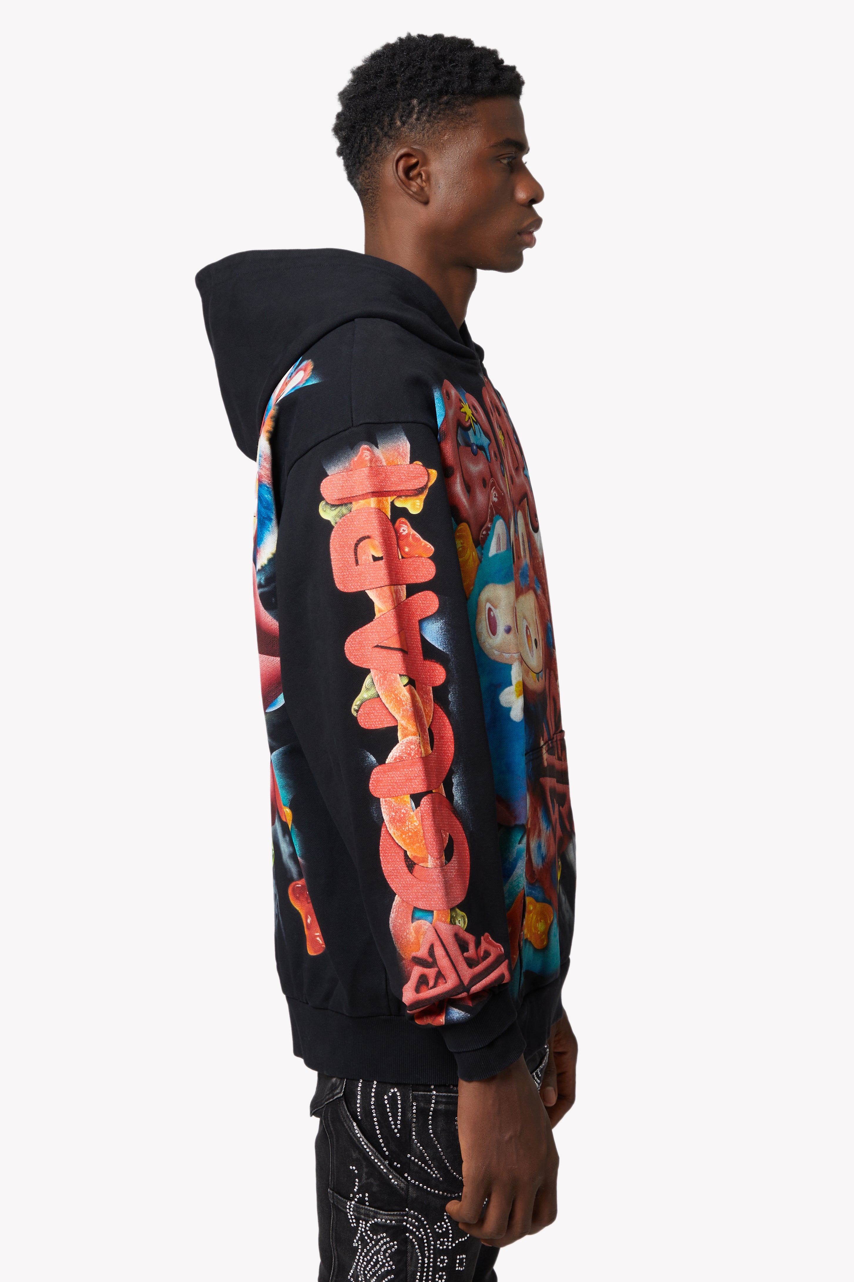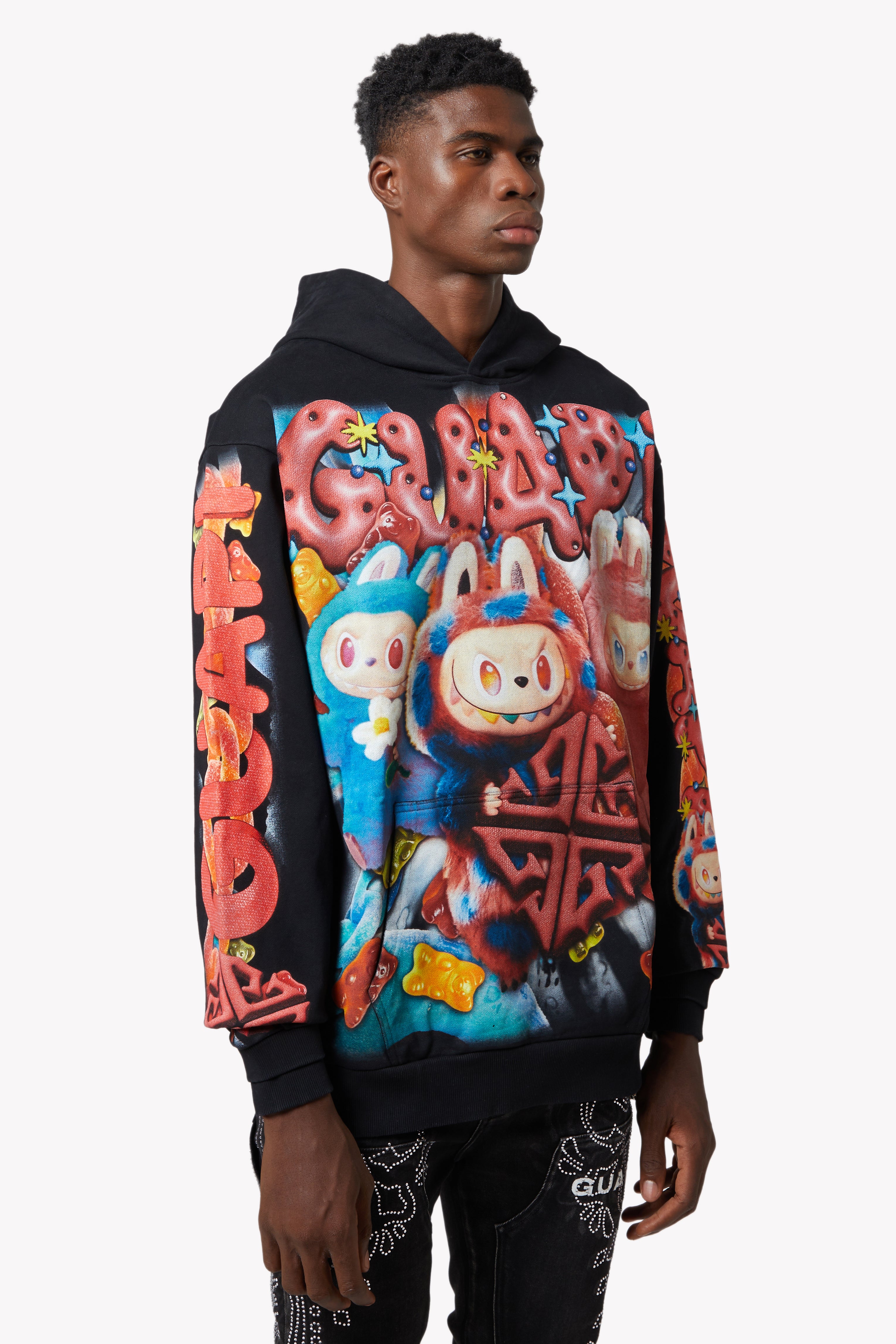 ねじれたリコリスチェーンから跳ねるグミベア、砂糖をまぶした渦巻き模様まで、このフーディーは甘い暴動のエネルギーに満ち溢れています。背中には、酸っぱいロープとキャンディーの爆発に包まれた特大のGUAPIモチーフが視覚的に広がり、袖にはそれぞれ遊び心のあるディテールが満載です。