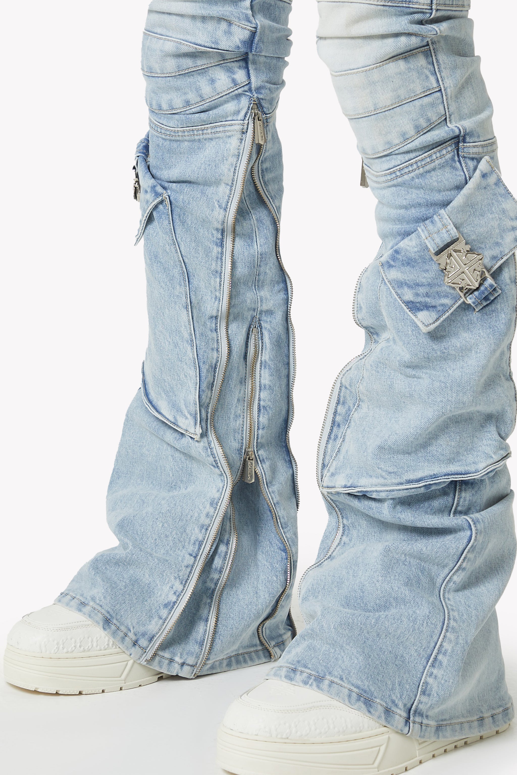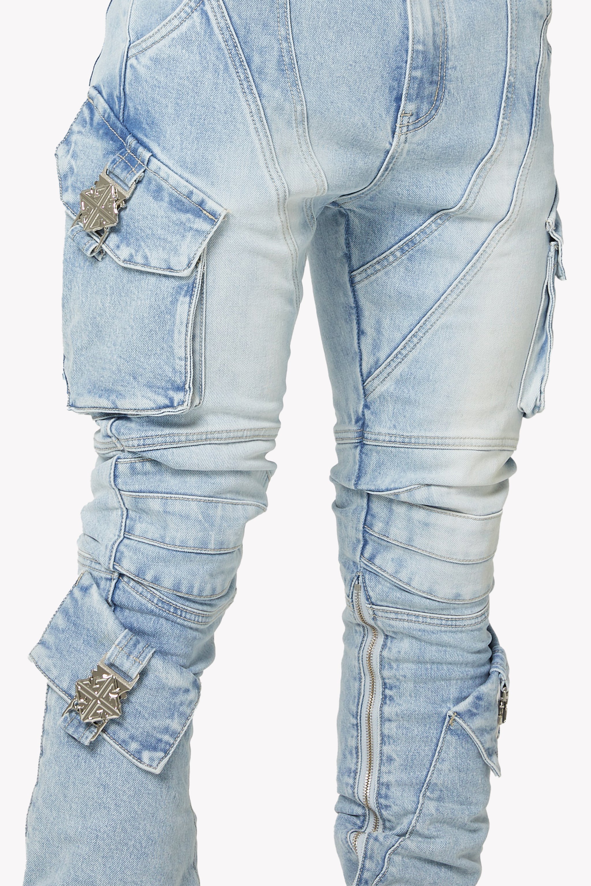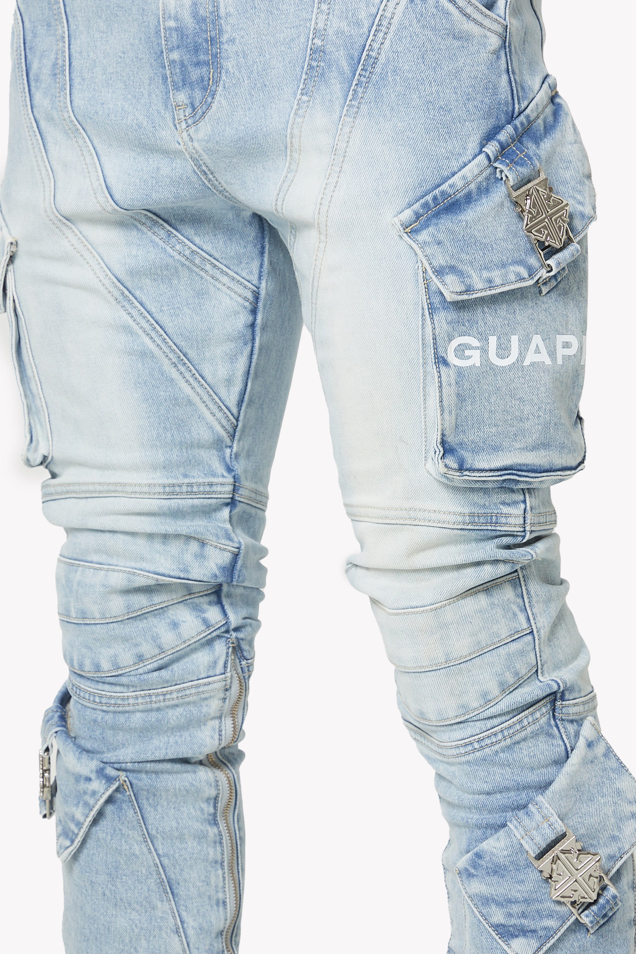 Oversized cargo pockets wrap around the thigh and calves, each secured with custom chrome GUAPI emblem buckles, turning utility details into statement hardware. Multi-directional seamwork runs across the legs, sculpting dimension and highlighting the fit. Full-length zippers along the inner calves allow adjustable flare, shaping the pant from stacked-skinny to open-boot style.