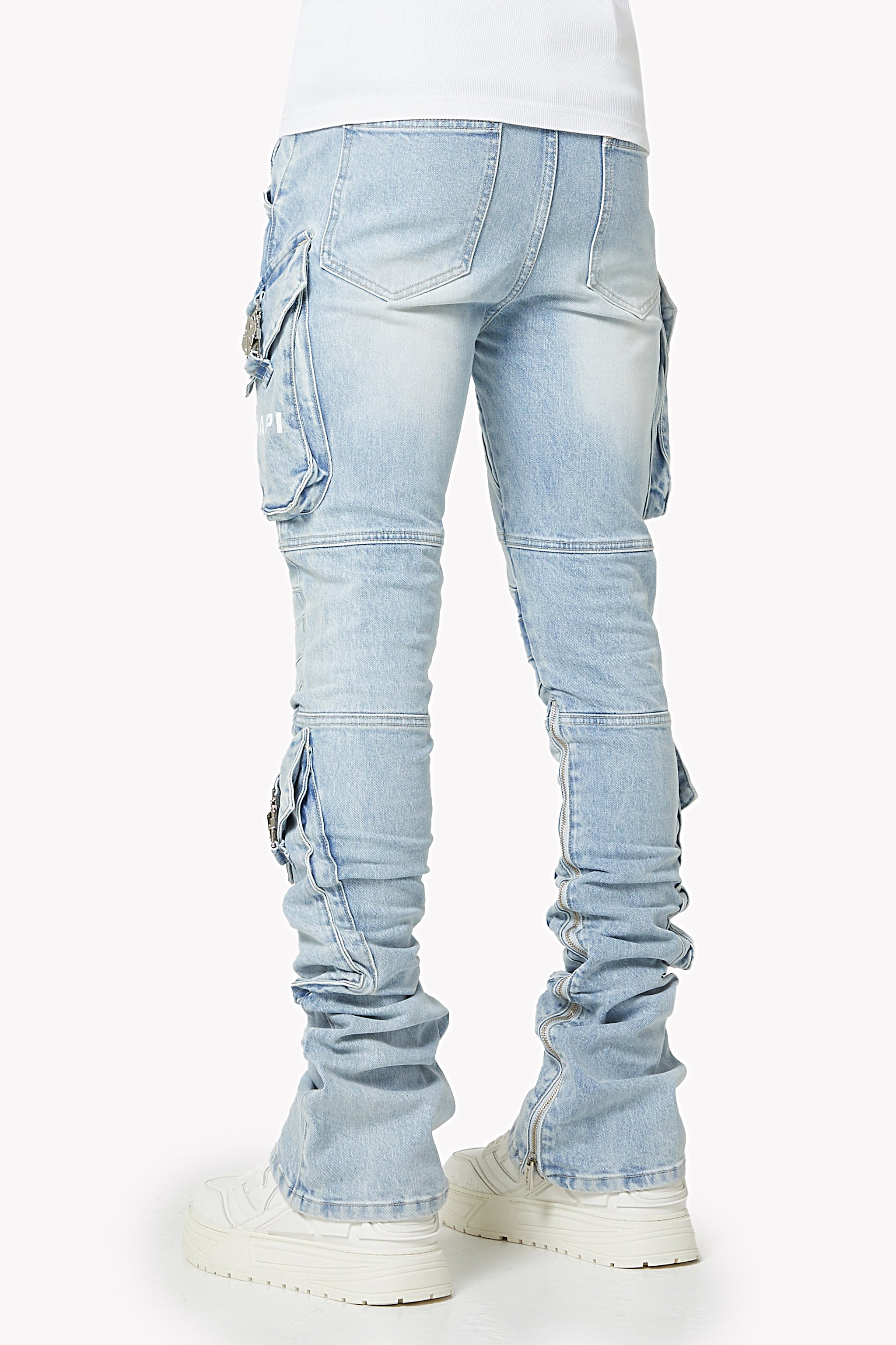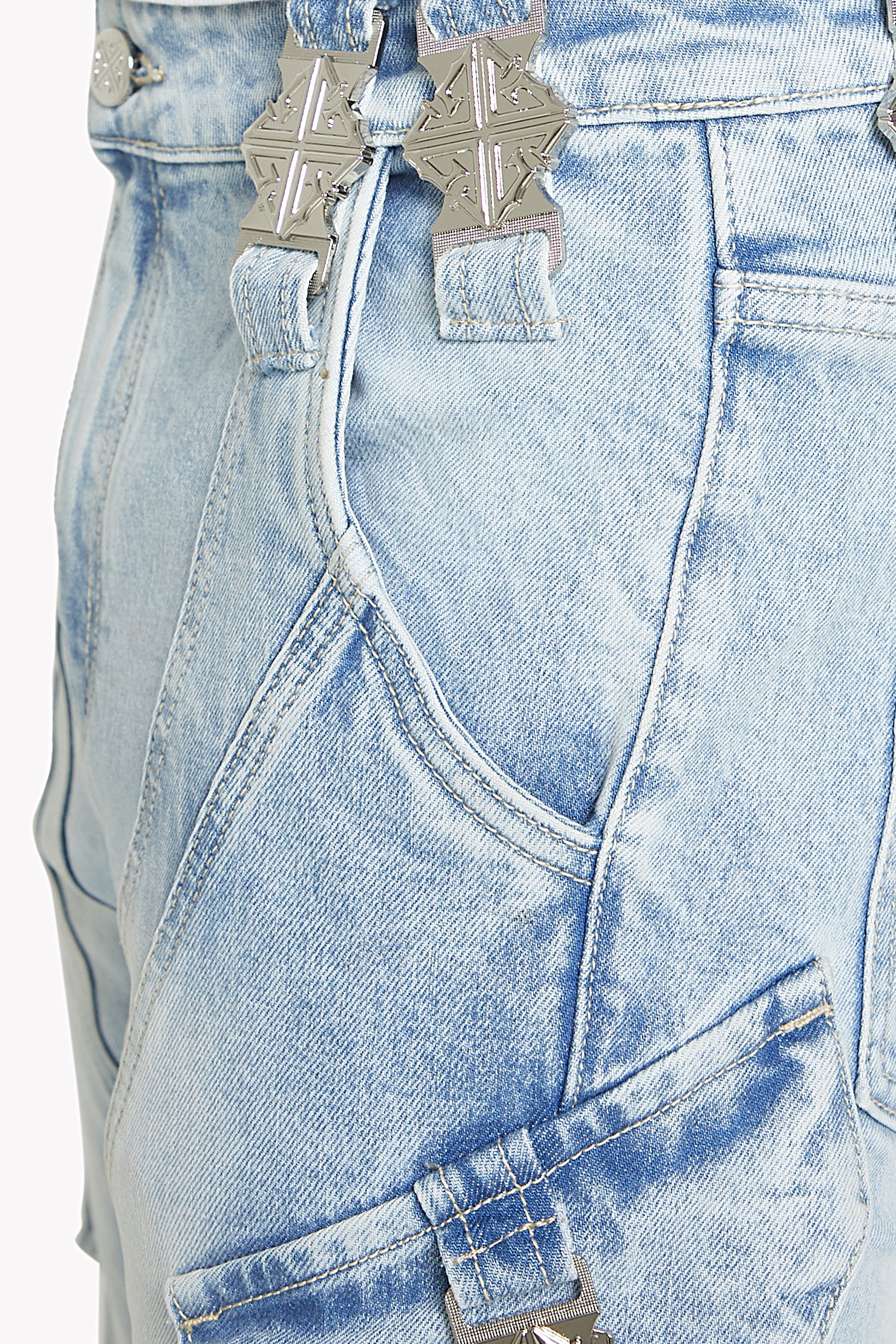 A bold fusion of tactical detailing and luxury denim construction, the Aqua Black Ops Denim brings GUAPI’s signature engineered aesthetic into a striking light-wash palette. Built with layered paneling and sculpted seams, the silhouette forms a stacked, structured look that stands out from every angle. The light aqua-blue wash is contrasted with heavy fading and hand-placed whiskering, giving the denim a worn-in, tactical feel.