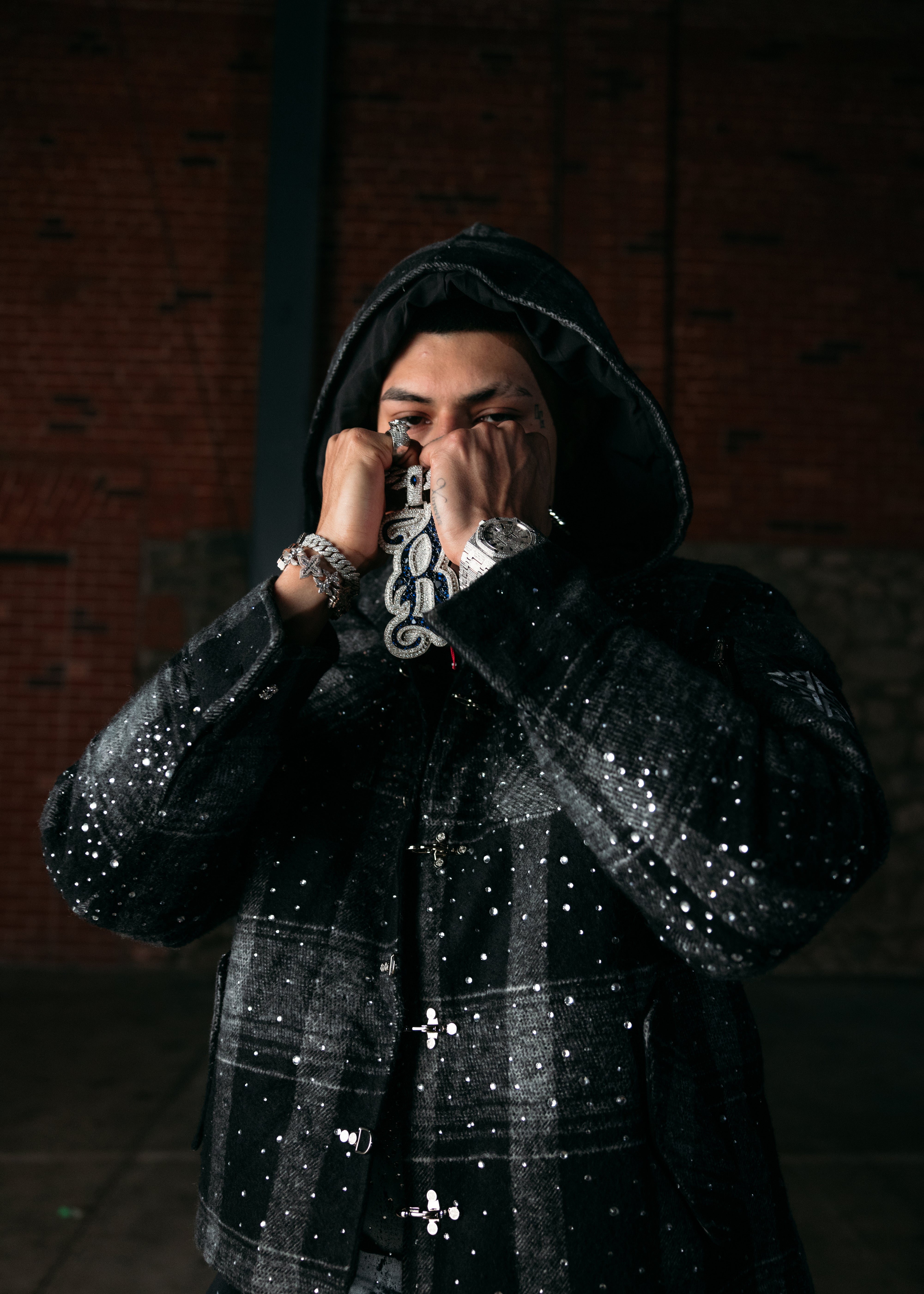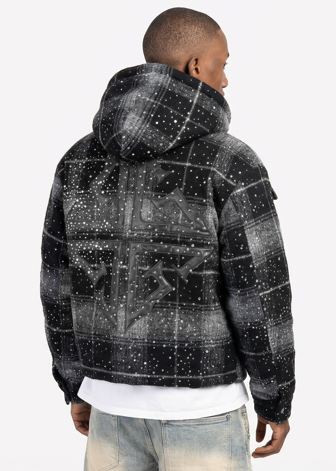 The Black Glacier Jacket is a statement outerwear piece that fuses rugged structure with GUAPI’s signature luxury detailing. Crafted from a heavyweight, premium fabric with a deep black glacier wash, the jacket features an all-over textured pattern accented by precisely placed rhinestones that catch the light with every movement—adding depth, shine, and unmistakable presence.