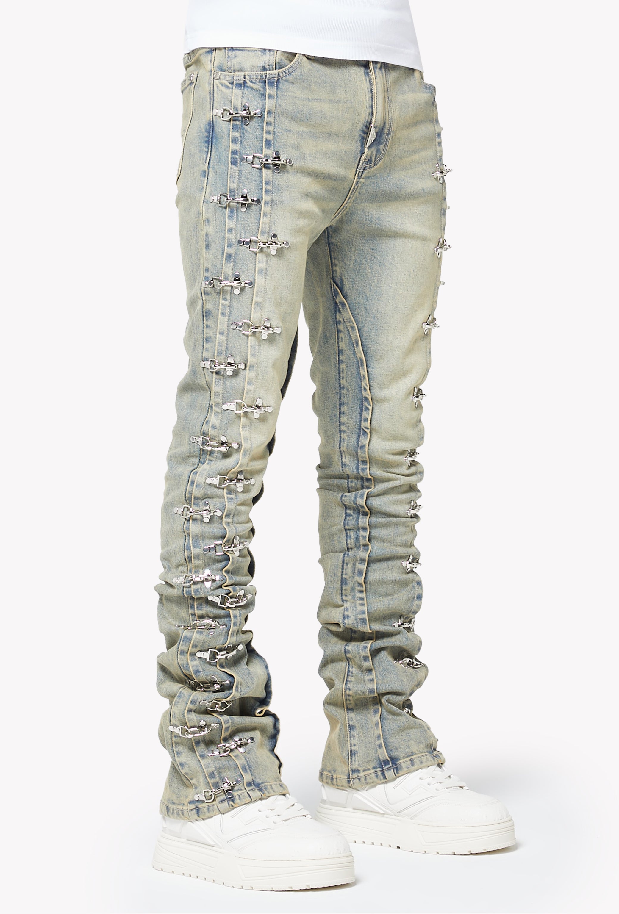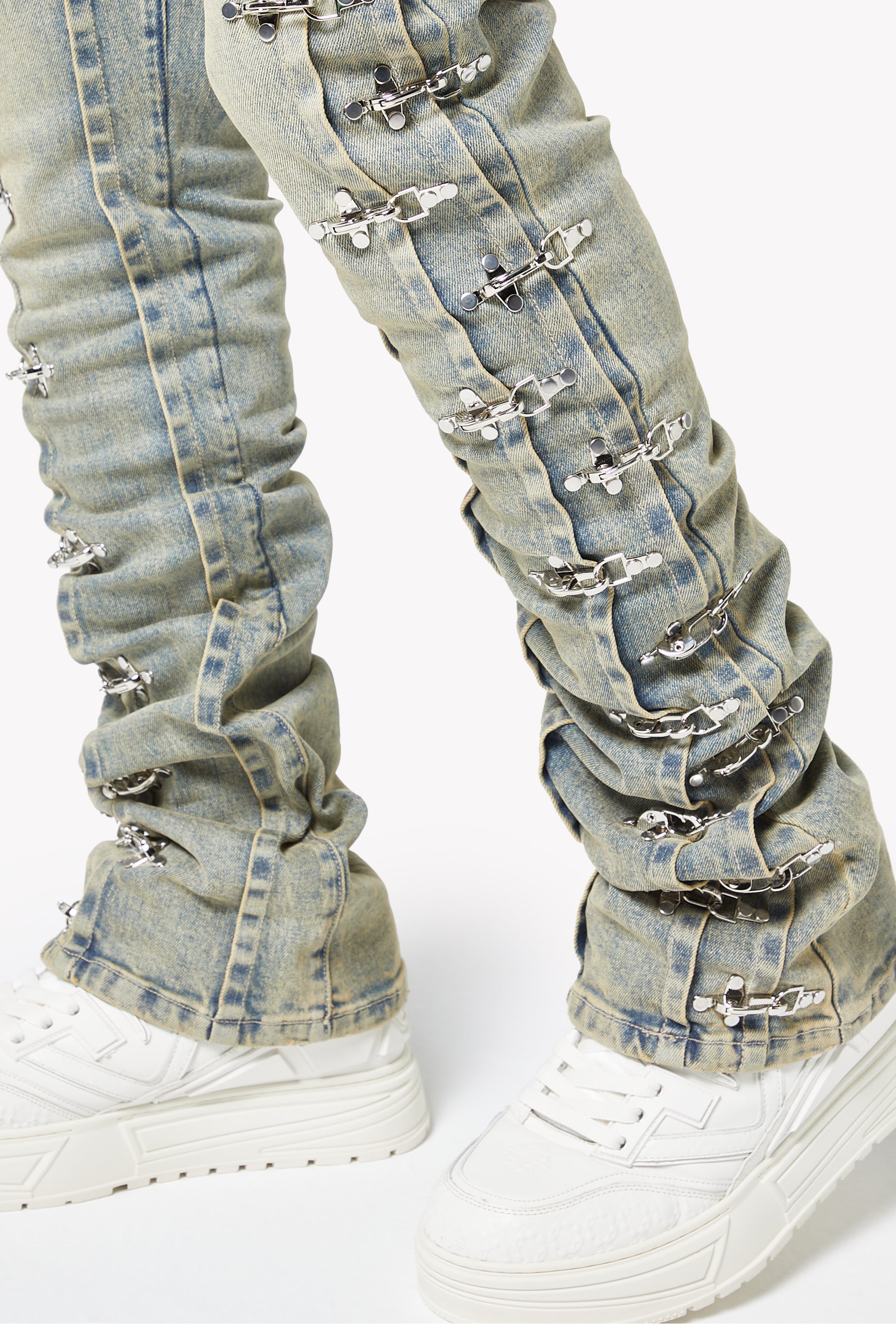 The Vintage Blue Aviation Clasp Denim blends GUAPI’s signature stacked silhouette with a bold industrial edge. Crafted in a soft, washed-down blue tone, these jeans carry a true vintage character with subtle whiskering and gradient fading throughout the legs. The standout detail is the full-length line of aviation-inspired metal clasps running down both outer seams, each one individually fixed, creating a sculpted, elevated look from hip to hem.